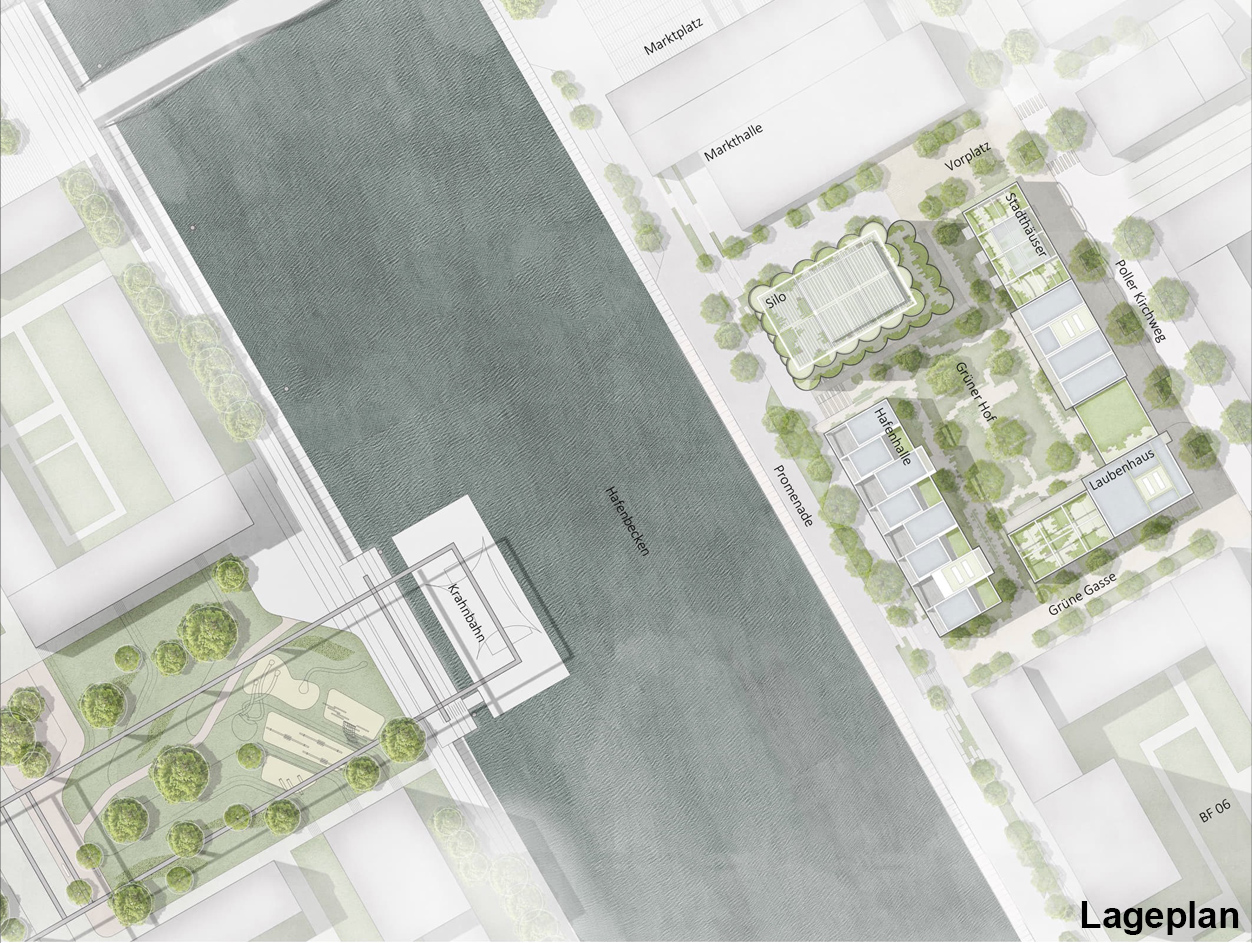Die Gebäudeensemble auf Baufeld 05 übersetzen den Quartierscode „Deutzer Block“ überzeugend in unterschiedliche Gebäudetypologien und schaffen damit ein glaubwürdiges und selbstverständliches Bild im Hafenkontext. Besonders hervorgehoben wurden die Möglichkeit einer hohen urbanen Durchmischung, die attraktive Fassadengliederung sowie gemeinschaftliche Angebote wie Dachterrassen. Städtebaulich gelingt es dem Entwurf, die einzelnen Bauteile in ein ausgewogenes Verhältnis zu setzen, den Hofraum als grüne Gemeinschaftsfläche zu gestalten und eine prägnante Adresse an der Hafenkante zu schaffen.